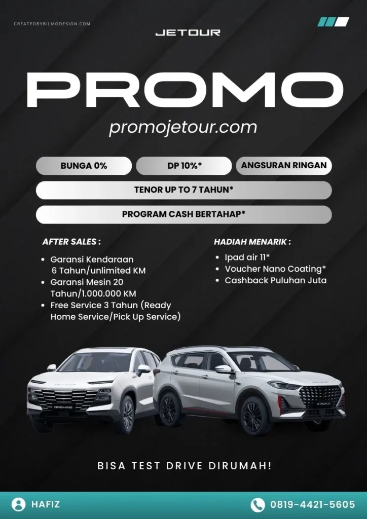 Pastikan anda tidak ketinggalan informasi PROMO yang diberikan oleh Hafiz Jetour karena selalu saja ada yang yang menarik dengan Informasi Jetour, Harga Jetour, Promo Jetour dan program lain.